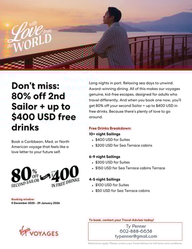 Don't miss 80% off 2nd sailor + up to $400 USD free drinks